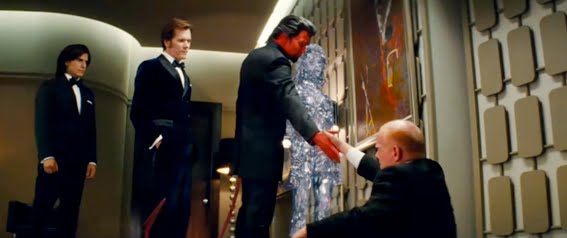 De izquiera a derecha, (sin contar al de extremo izquierda) Kevin Bacon como Sebastian Shaw, Jason Flemyng como Azazel y January Jones es Emma Frost.